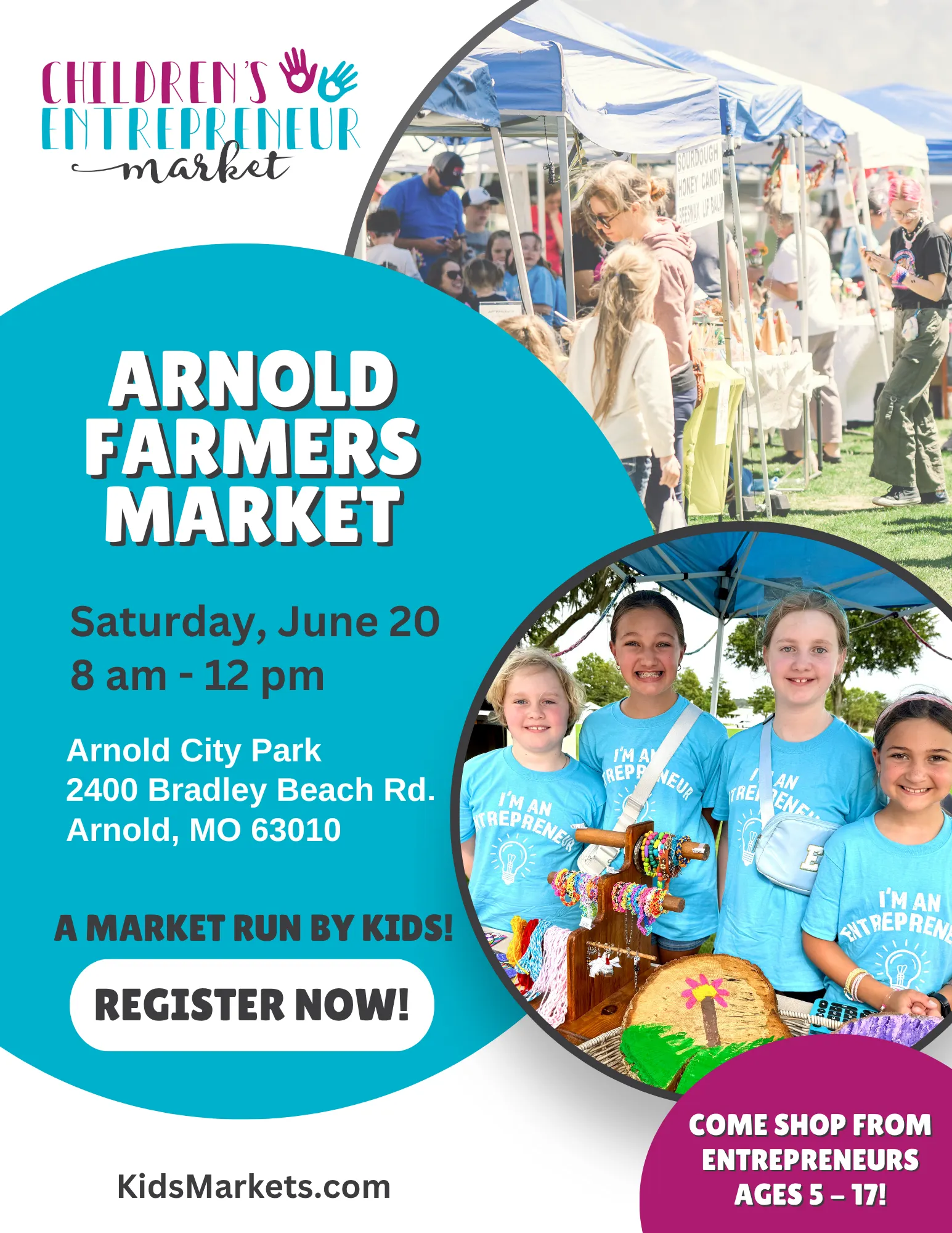 The Arnold Farmers Market has been in operation for 15 years, and this is the chance for your young entrepreneur to be a part of it! Your child will have the chance to learn and grow their business dreams, selling their products to the many customers who frequent the Arnold Farmers Market. Don’t miss this great opportunity for your child to learn, earn, and grow!
