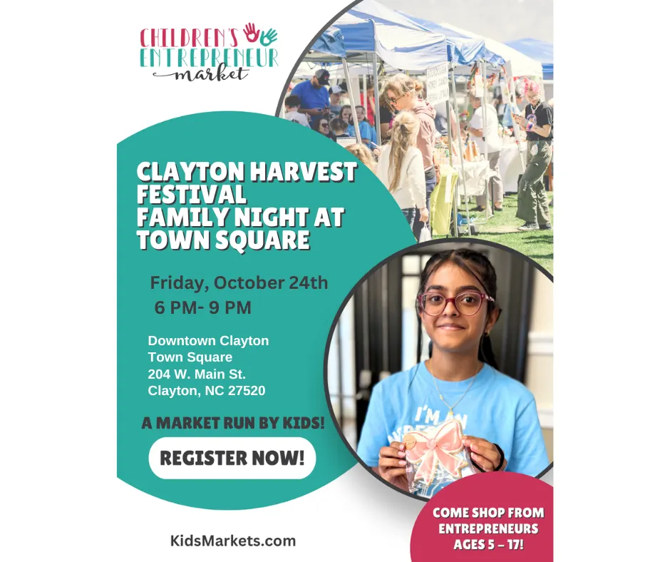Bring the whole family to Clayton’s Harvest Festival: Family Night At Town Square! Join us for trunk or treat, an outdoor movie, food trucks, and vendor shopping with our little entrepreneurs. We anticipate 300 patrons at this event!