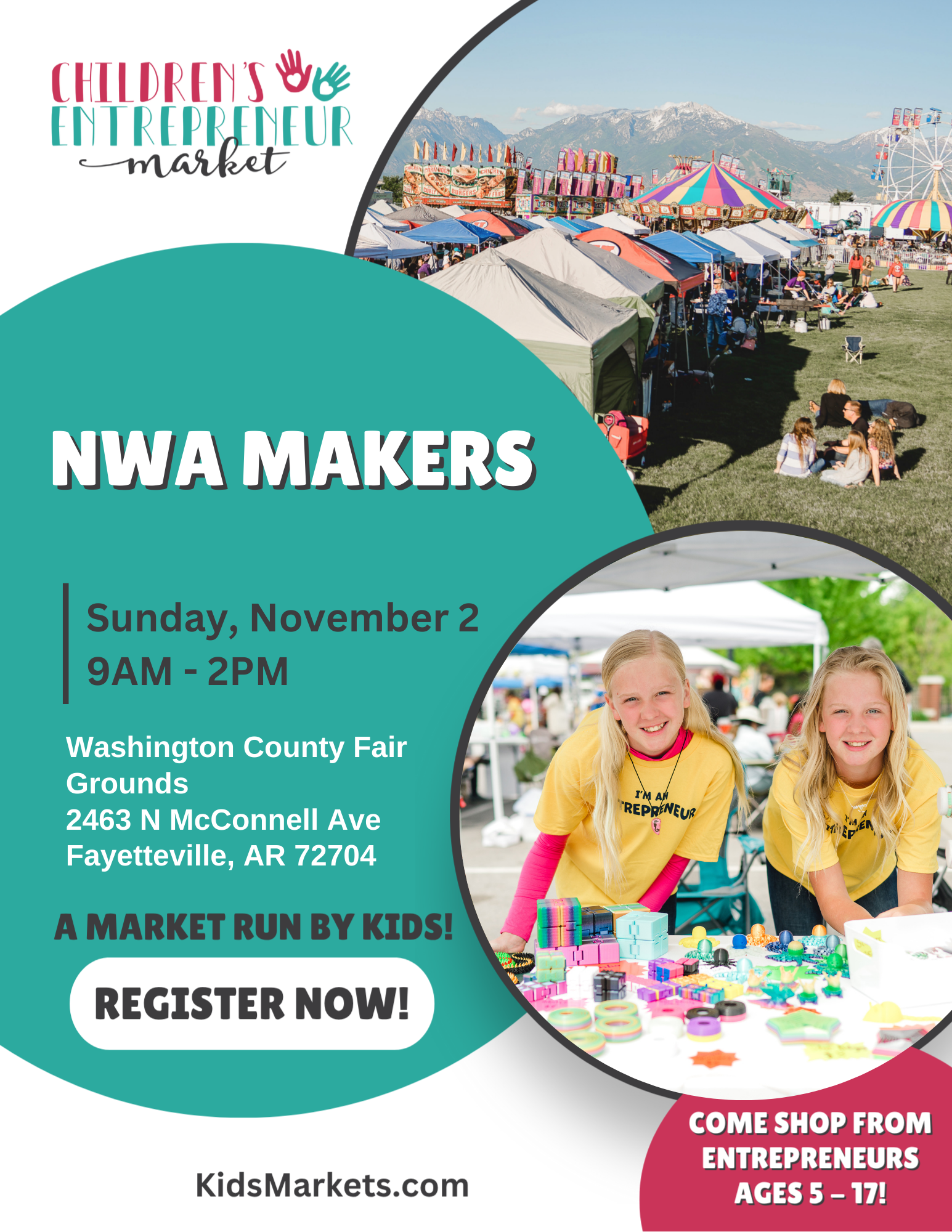 The Children’s Entrepreneur Market is thrilled to be back with NWA Makers for the Big Fall Event! Local kids, come join artists, makers, and craftsmen from across Northwest Arkansas to showcase your amazing products and creativity.
