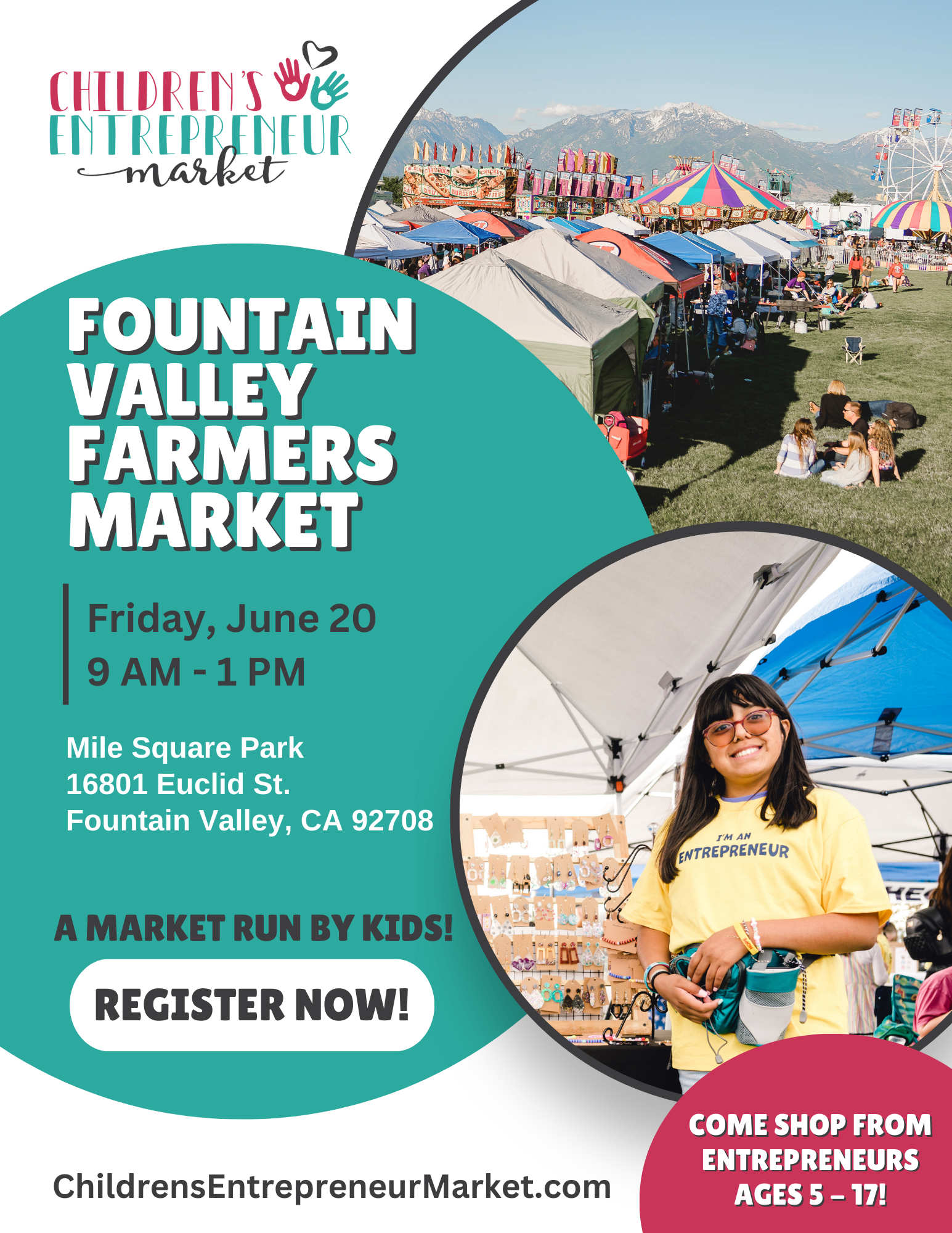 Kids are invited to participate in Fountain Valley’s Mile Square Park Farmers’ Market! Start the summer off with a fun entrepreneurial experience! 300 patrons expected.