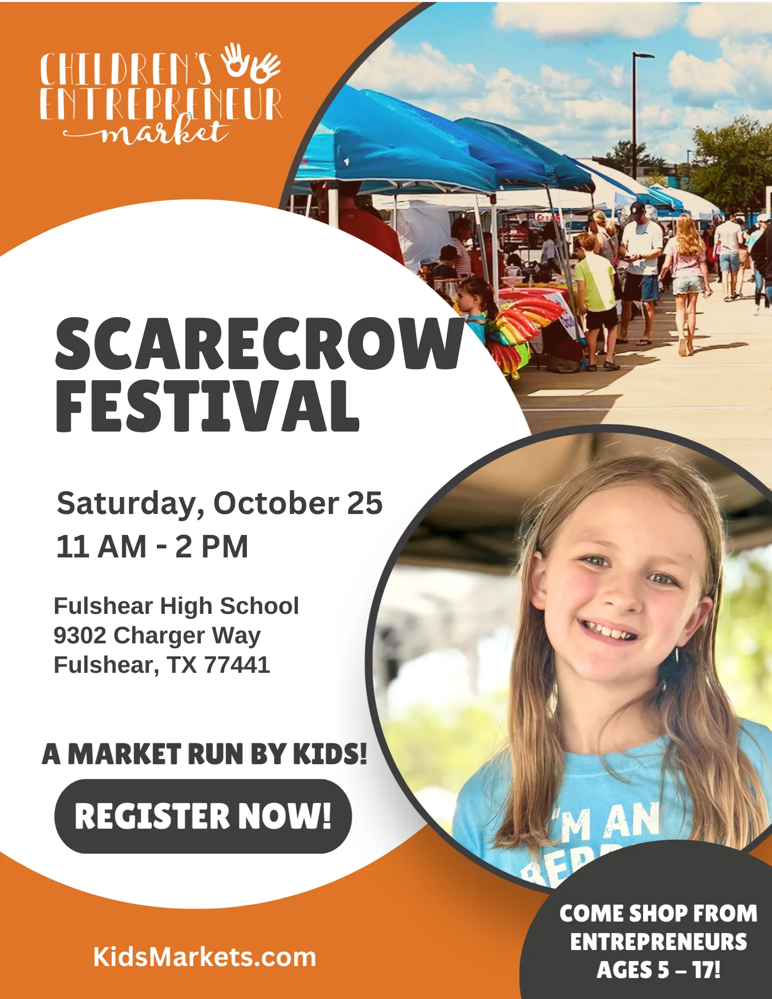 Our farmers market run entirely by kids will be at the Scarecrow Festival this October. Come and join us for the 6th Annual Scarecrow Festival! It’ll be an afternoon of fun: Trunk or treat, food trucks, costume contests, live music, and shopping from local kid entrepreneurs. We anticipate 3,000 patrons at this event!
