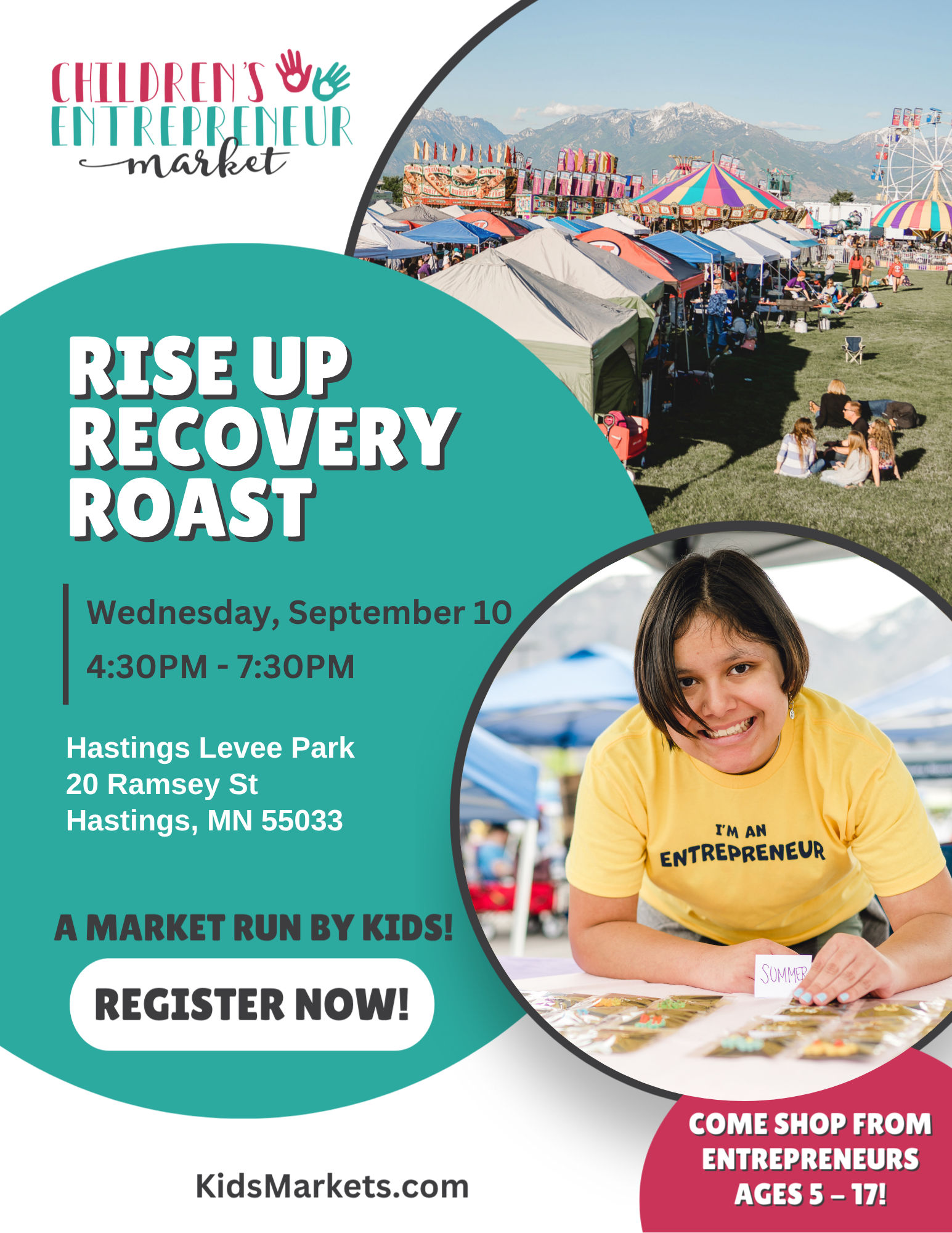Join Rise Up Recovery for its annual community event, spotlighting the award-winning Kids Market! Young entrepreneurs will sell their unique wares and tasty treats. Enjoy music, FREE slow-roasted pork, and meaningful recovery connections at this fun-filled evening!