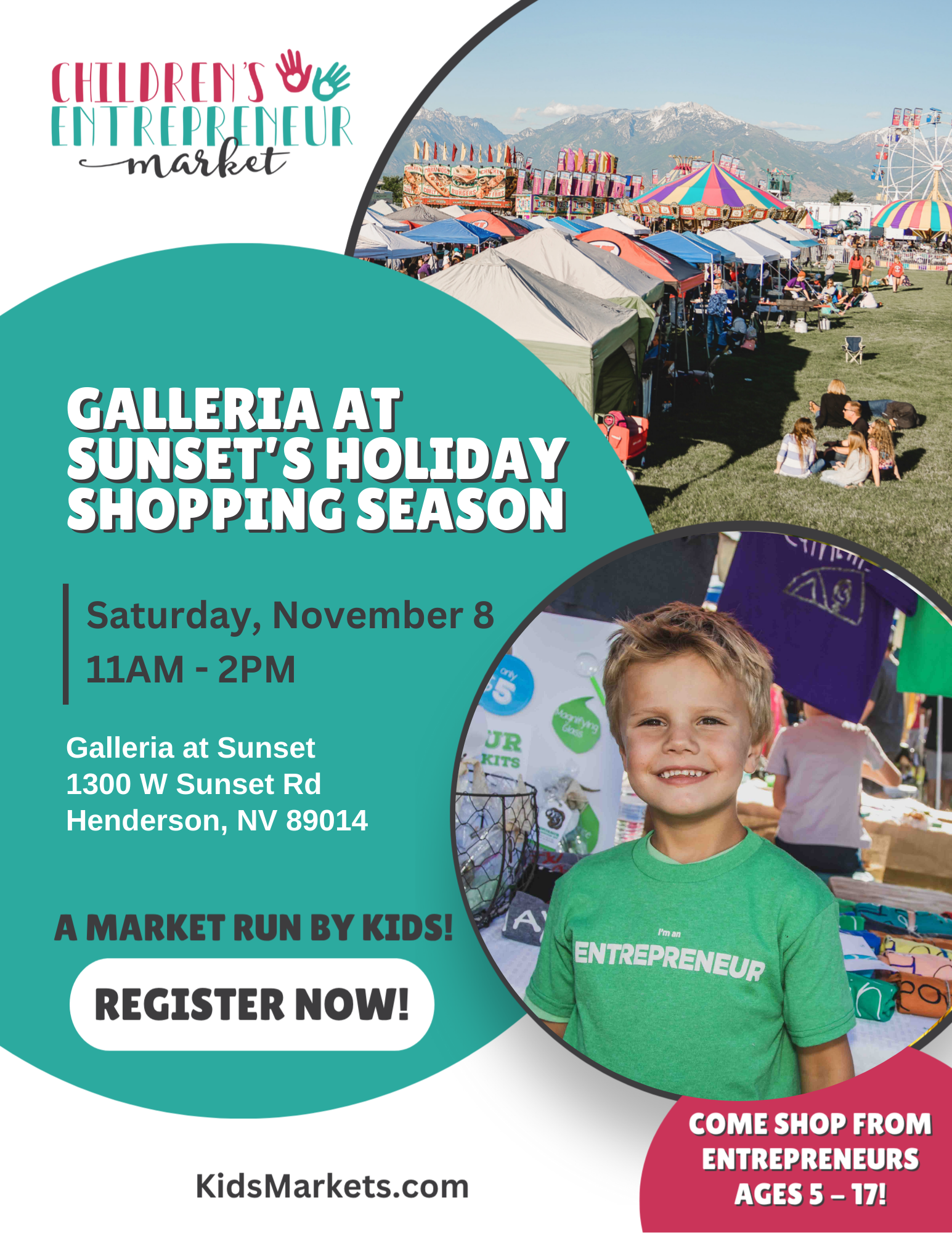 We are excited to help kick off Galleria at Sunset’s Holiday shopping season. Our market will be located on the first floor directly below the food court. We are expecting lots of foot traffic and a great experience for you, young entrepreneurs!