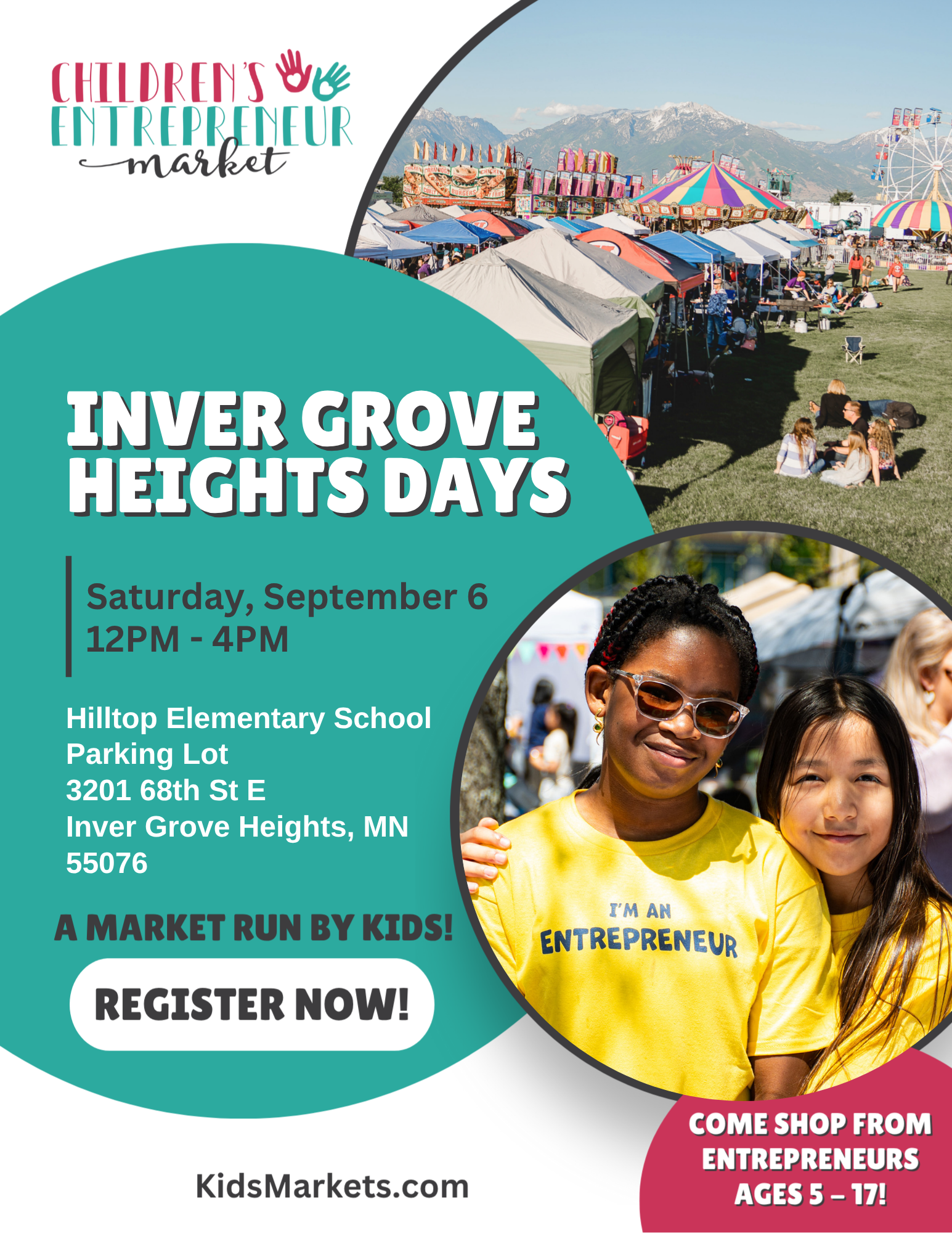 Join Inver Grove Heights Days 2025 for fun, food, music, cars, bingo, fireworks, and the “Inver Glow Heights” walk! Be part of the Kids Market at the end of the parade route, where kids sell creative goods, learning business skills in a vibrant family-friendly setting!