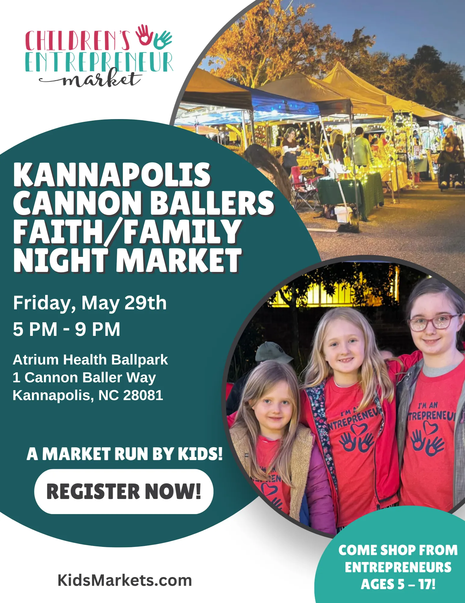 Faith & Family Night at the Kannapolis Cannon Baller’s Ballfield is a special opportunity for kid vendors! Young entrepreneurs can showcase and sell their crafts, art, treats, and creations to families enjoying a fun-filled night with live music, inflatables, and baseball—an exciting event for the whole family.