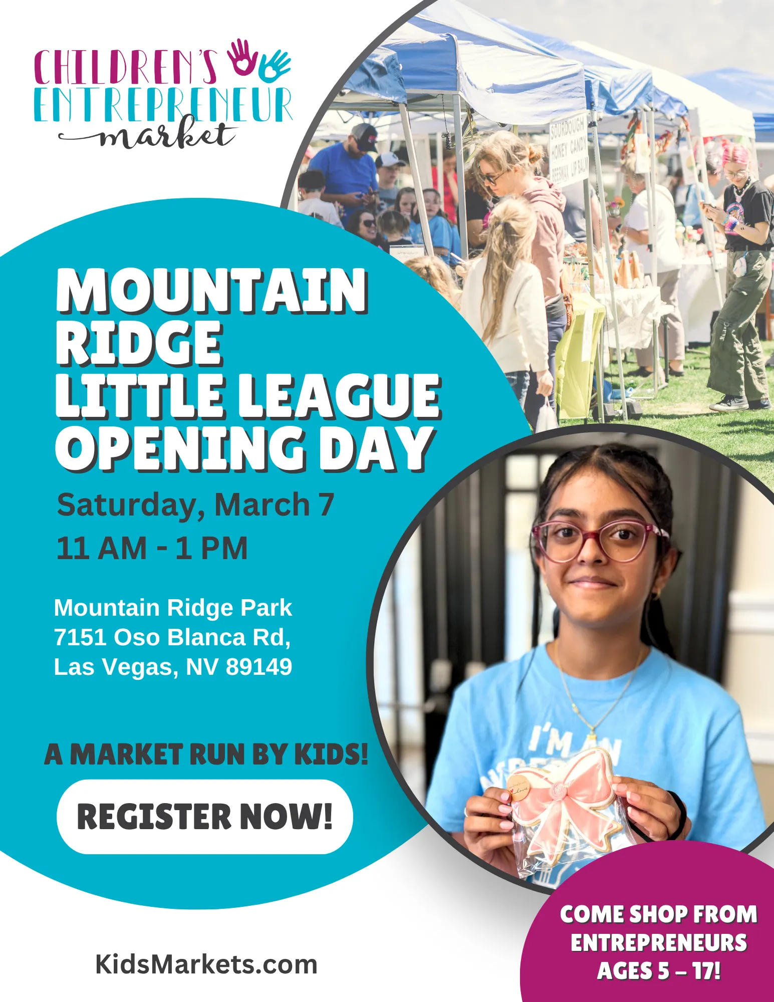 Play ball… and play business! Join the excitement of Mountain Ridge Little League Opening Day and let your child be an entrepreneur! They will pitch their product ideas, practice public speaking, and learn real-life money skills in a fun, high-energy, community environment.