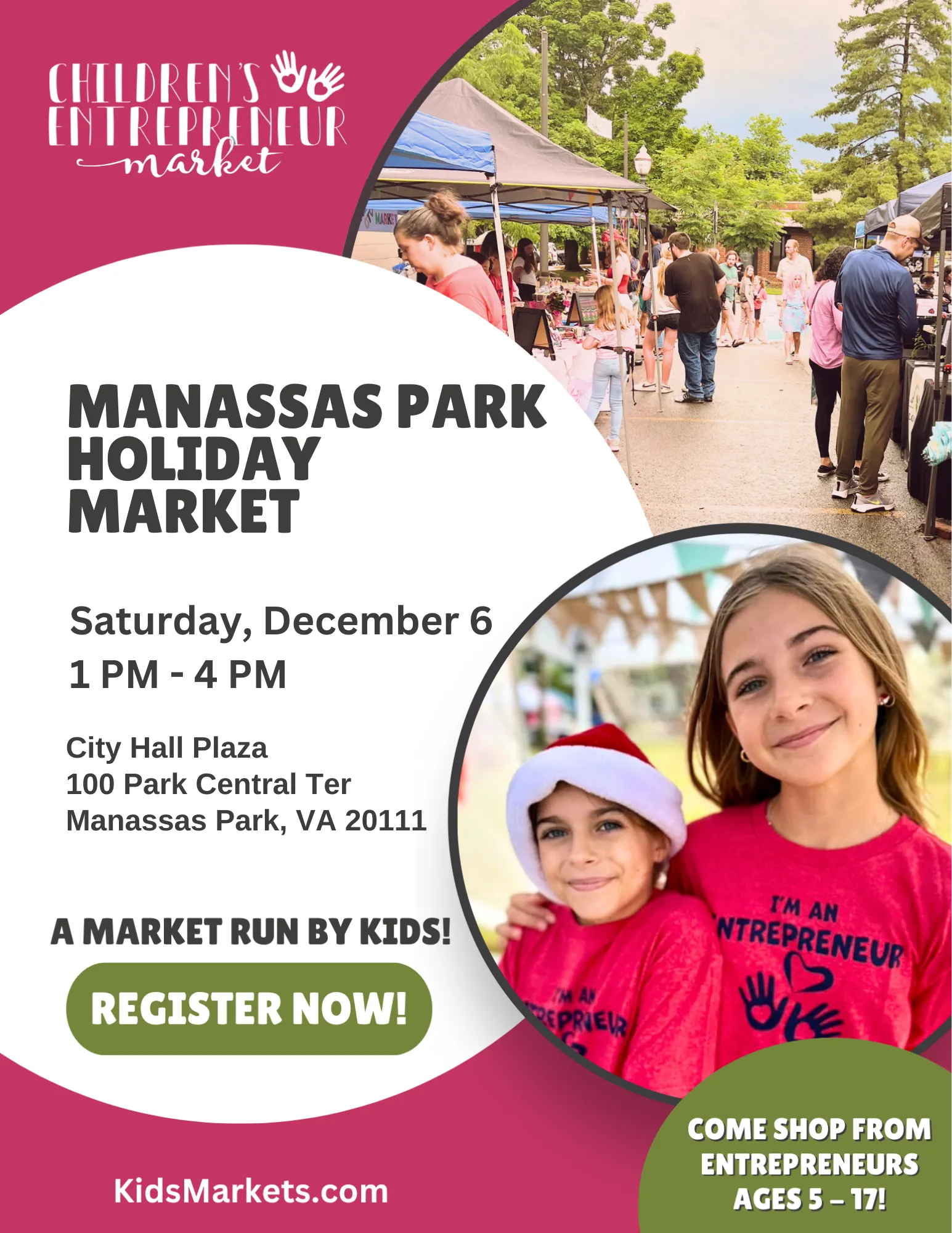 Give your young entrepreneur the chance to shine at as we join the Manassas Park Holiday festivities at our kid-run Holiday Market! Kids learn real business skills as they create products, set prices, and interact with shoppers—all in a festive, high-energy setting packed with holiday excitement.