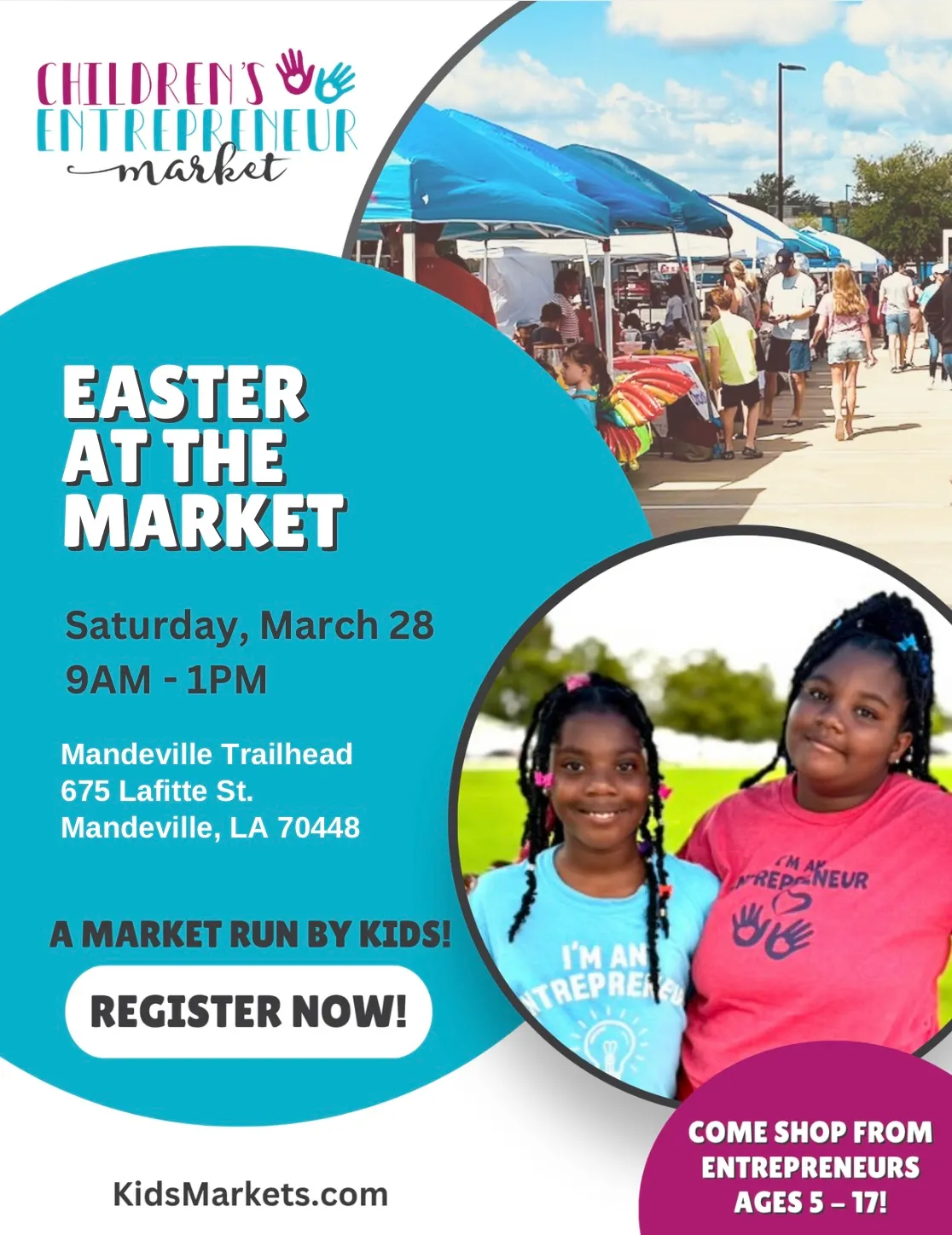 Have a young creator, maker, or mini-CEO at home? The Children’s Entrepreneur Market is joining Easter at the Market at the Mandeville Trailhead! Kids can sell handmade crafts, treats, art, and creative goodies while building confidence and real-world skills. Families are invited to come shop, meet the young entrepreneurs, and support kid-run businesses in a fun, spring celebration!