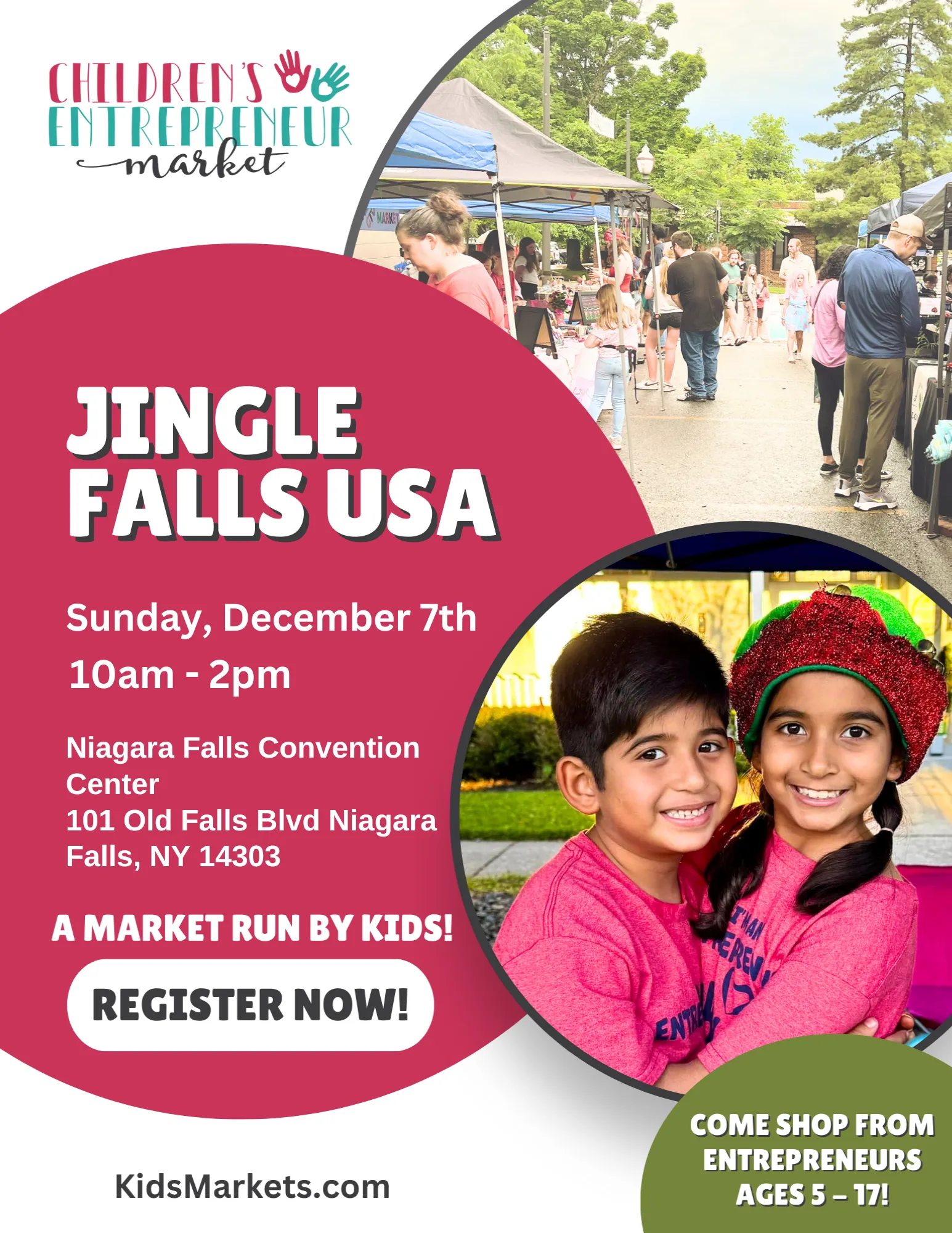 Hey kids! At the Children’s Entrepreneur Market at Jingle Falls USA, YOU get to be the boss—selling your crafts, treats, or creations at your very own holiday booth. Show off your talents, spread Christmas cheer, and have fun while shoppers buy your amazing gifts. Spots are limited, so sign up today!