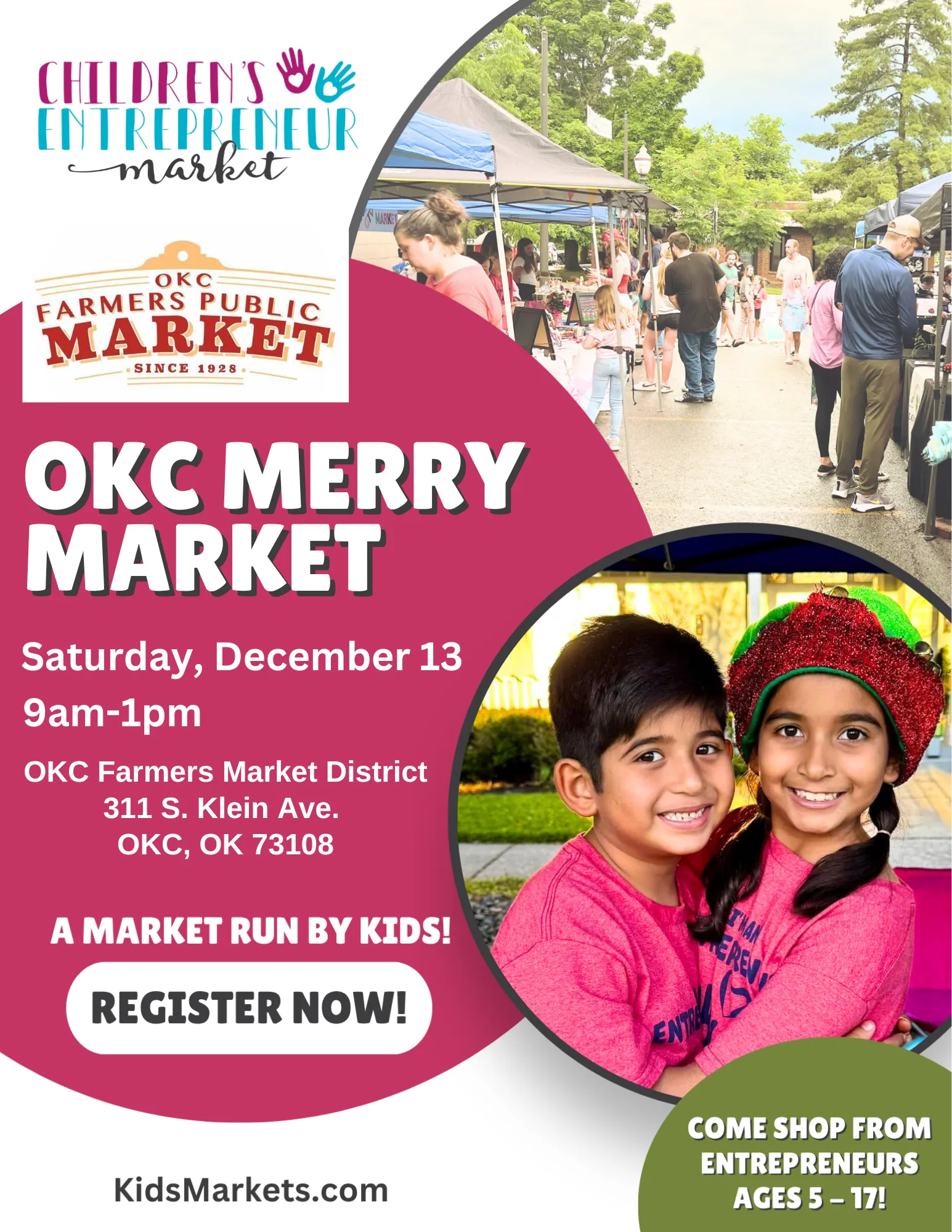 Give your child the chance to shine at our indoor Holiday Market—held just upstairs from the Historic OKC Farmers Public Market! With over 500 holiday shoppers expected, it’s the perfect opportunity for kids to sell their handmade crafts, baked goodies, or creative gifts in a warm, festive, and family-friendly atmosphere. Spots are limited—register now and help your young maker turn their ideas into holiday income!