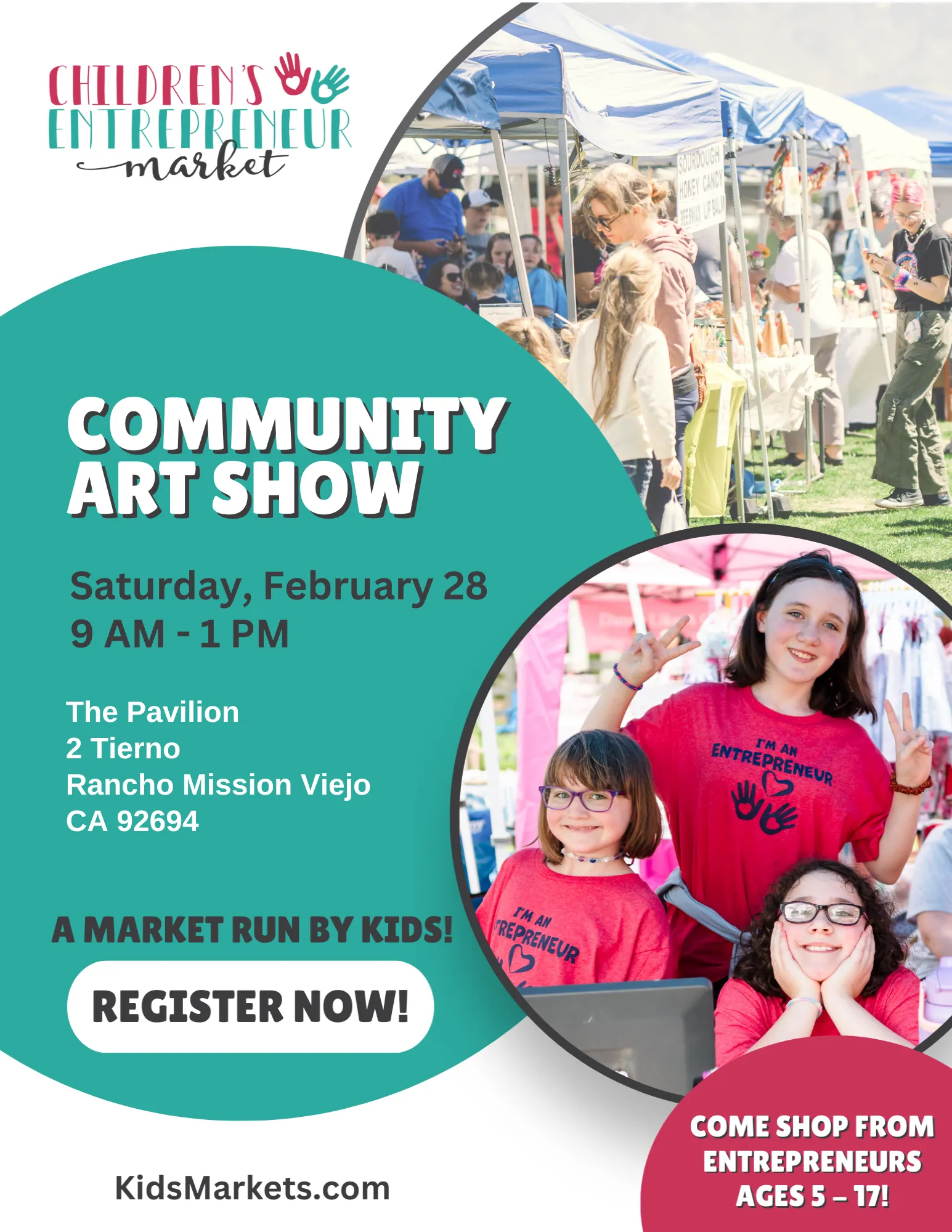 Join us at The Pavilion in Rancho Mission Viejo for the Community Art Show, where loads of creative excitement will fill the air! Our markets are a unique opportunity for kid-preneurs to develop an entirely different set of social skills, confidence, and resilience that comes with nurturing a passion for their craft that they can share with the community.
