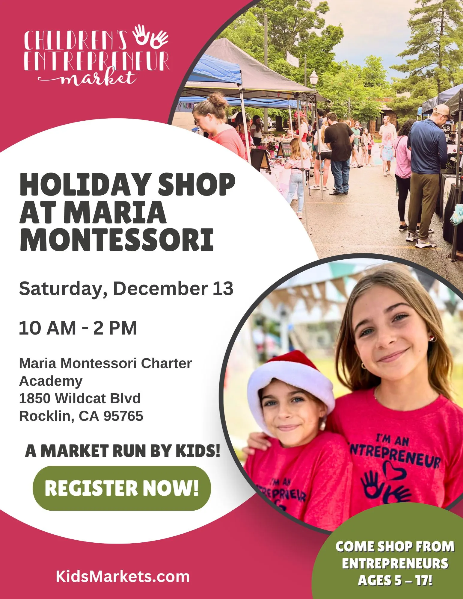Sign your child up for the Kids Market at Maria Montessori Charter’s Holiday Shop on December 13! It’s the perfect place for young creators to share their handmade gifts, crafts, and creations with classmates and families. A cheerful day of shopping, creativity, and holiday spirit — made by kids, for everyone!
