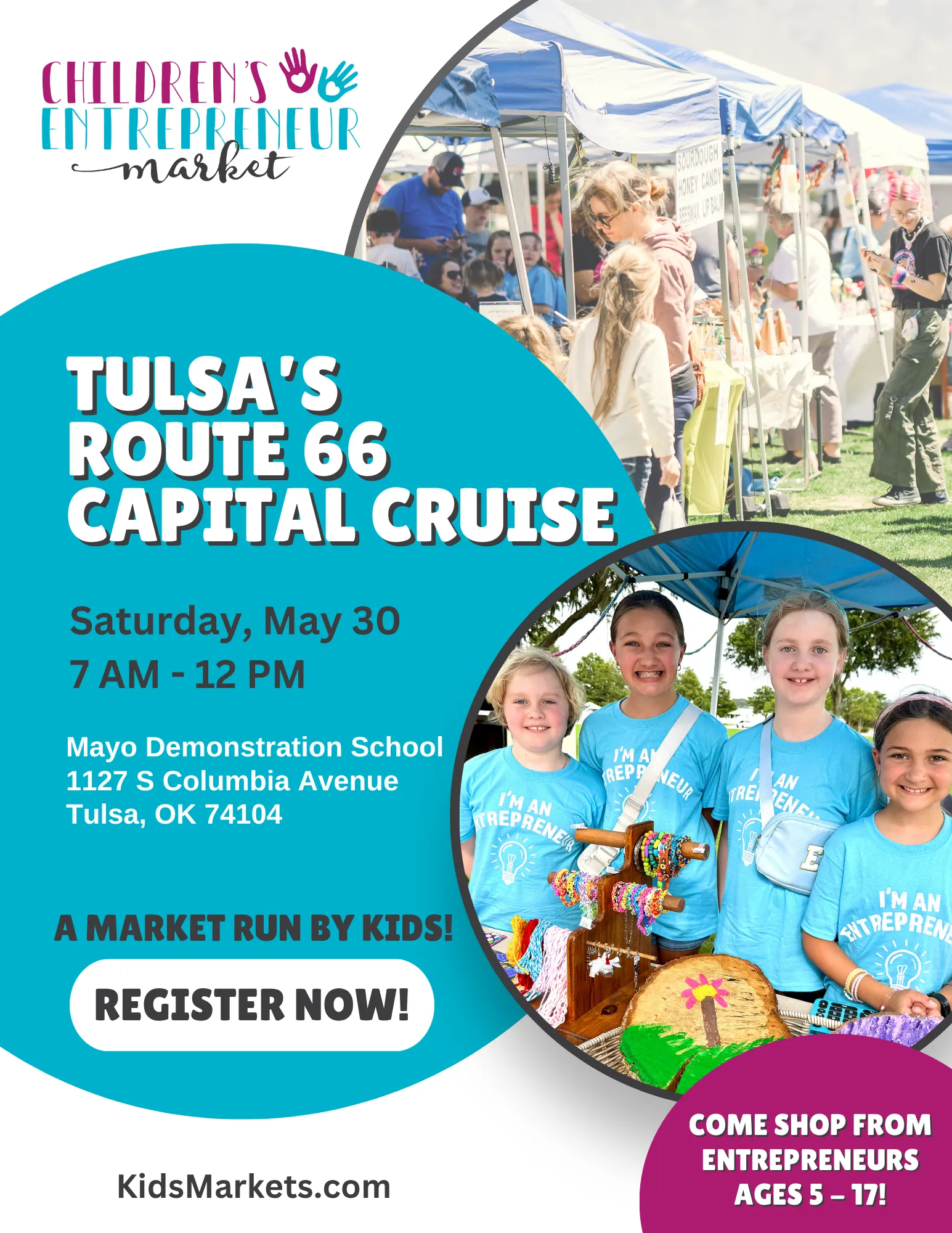 Come be a part of history as Tulsa gears up to attempt a world record title for the largest classic car cruise ever—celebrating 100 years of the iconic Mother Road— your kids can set up their booths right in the heart of the action! They can showcase their creativity, sell handmade crafts, treats, art, or whatever their business idea is, and learn real-world skills while surrounded by thousands of patrons! Don’t miss this once-in-a-lifetime experience!