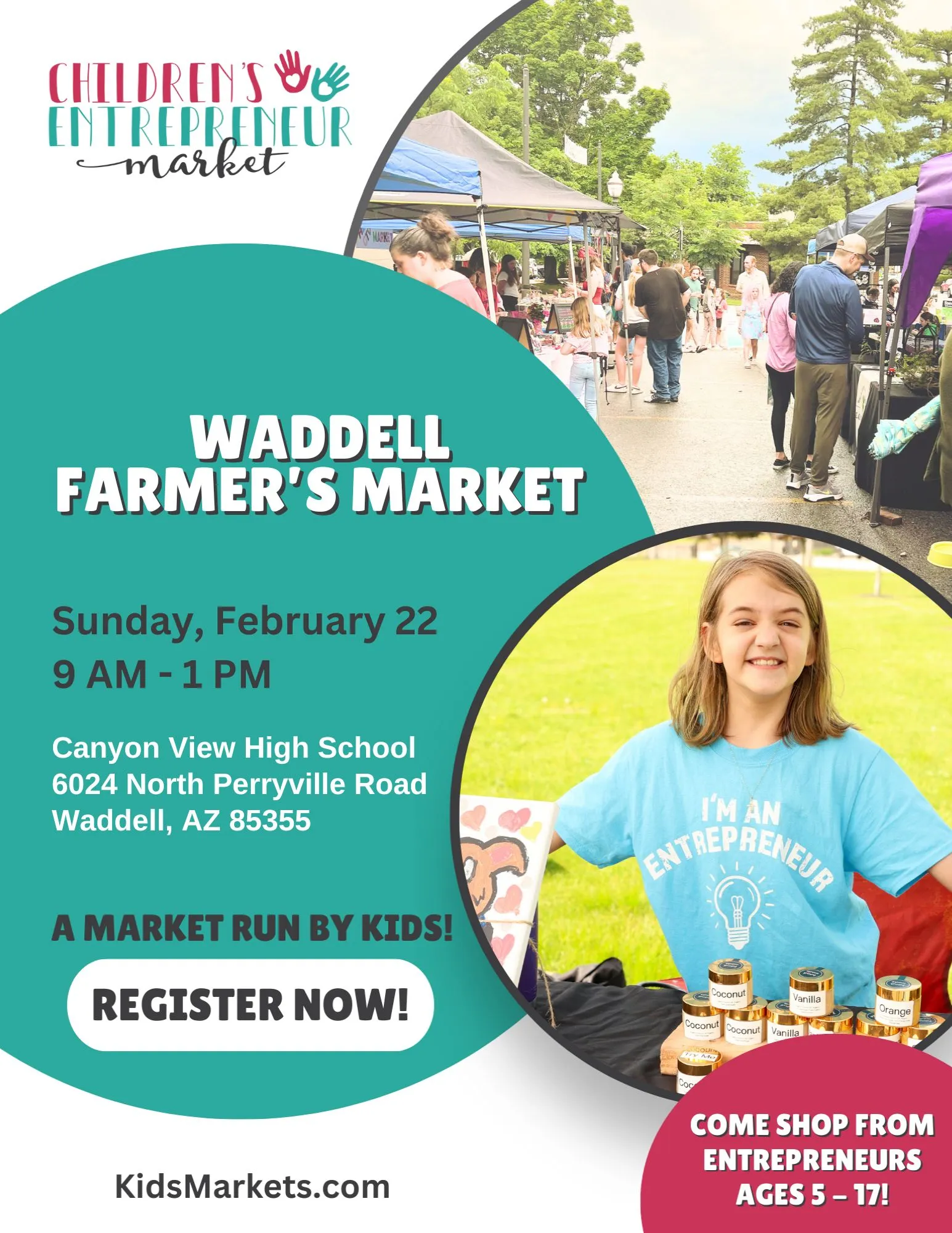 Join us for a fresh and fun-filled day at the Waddell Farmer’s Market, featuring the Children’s Entrepreneur Market—where your young business owner can sell their handmade goods, tasty treats, and creative services. Youth learn valuable skills like money handling, inventory management, and customer service, and get to take home all their profits!