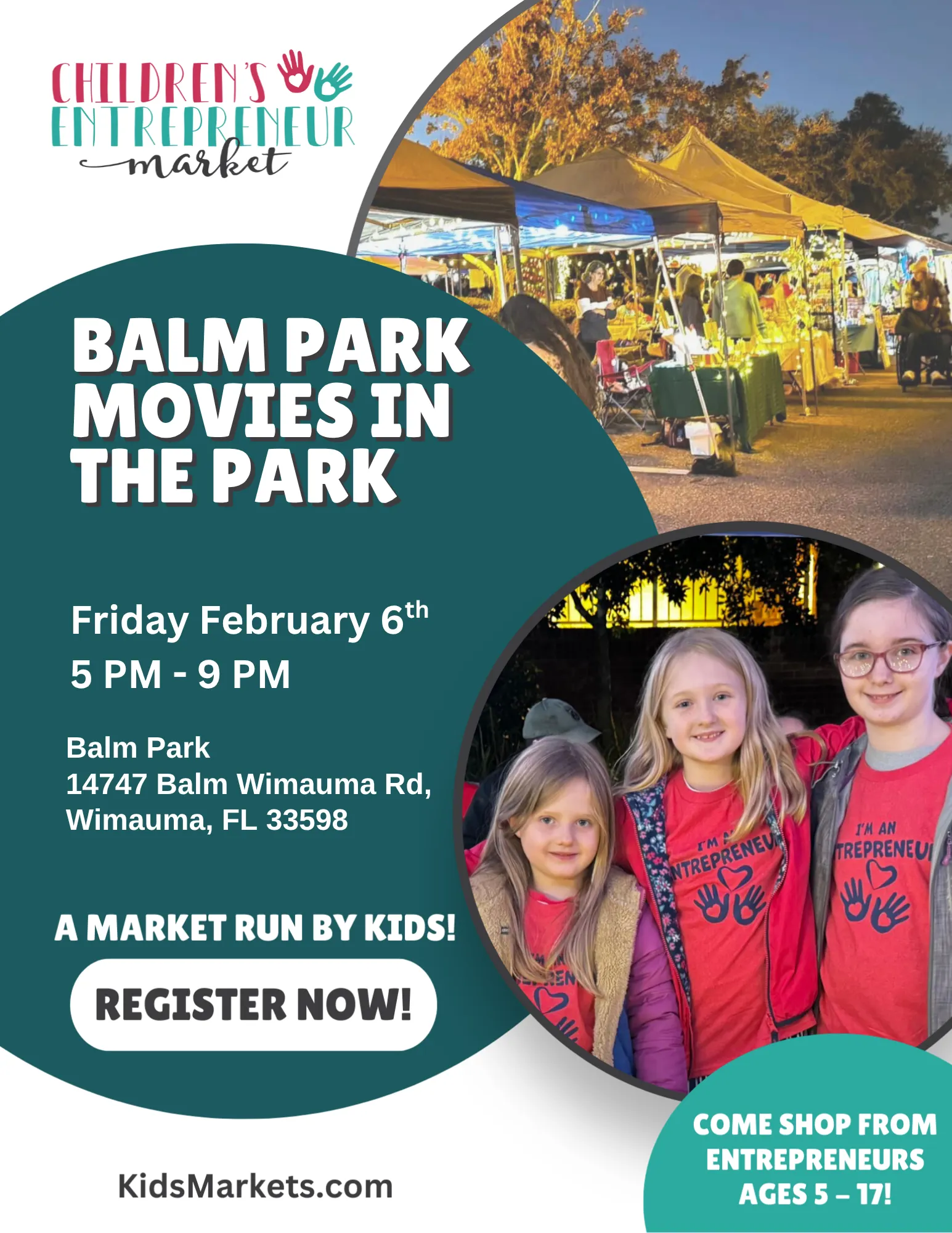 Join us at Movies in the Park at Balm Park for a fun Kids Market! Kids can show off their creativity, sell handmade crafts, and explore entrepreneurship—all in a lively community atmosphere. Don’t miss this family-friendly evening under the stars!