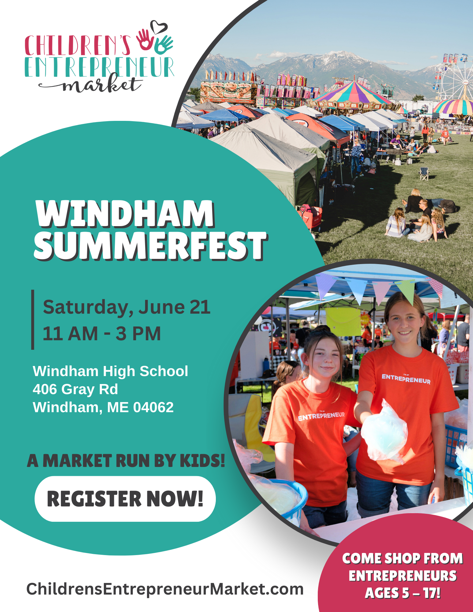 Join us at Windham Summerfest! The children’s market runs from 11am-3pm, then head out to enjoy an inflatable park, live music, jugglers, magicians, and more. We anticipate 500 patrons at this event!