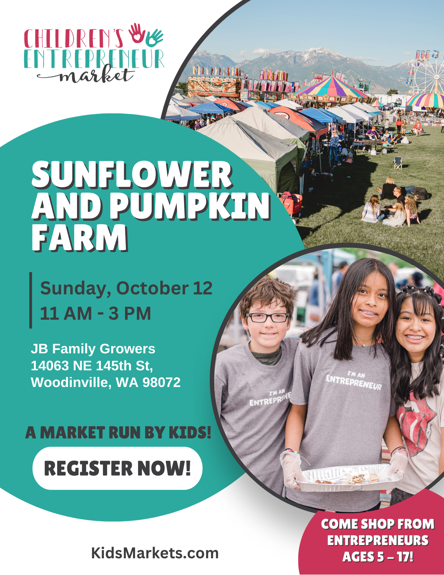 It’s sunflower and pumpkin season! Sign up to sell your products amid JB Grower’s acres of flowers and pumpkin fields in the heart of Woodinville Wine Country. This peaceful setting is sure to attract lots of people.