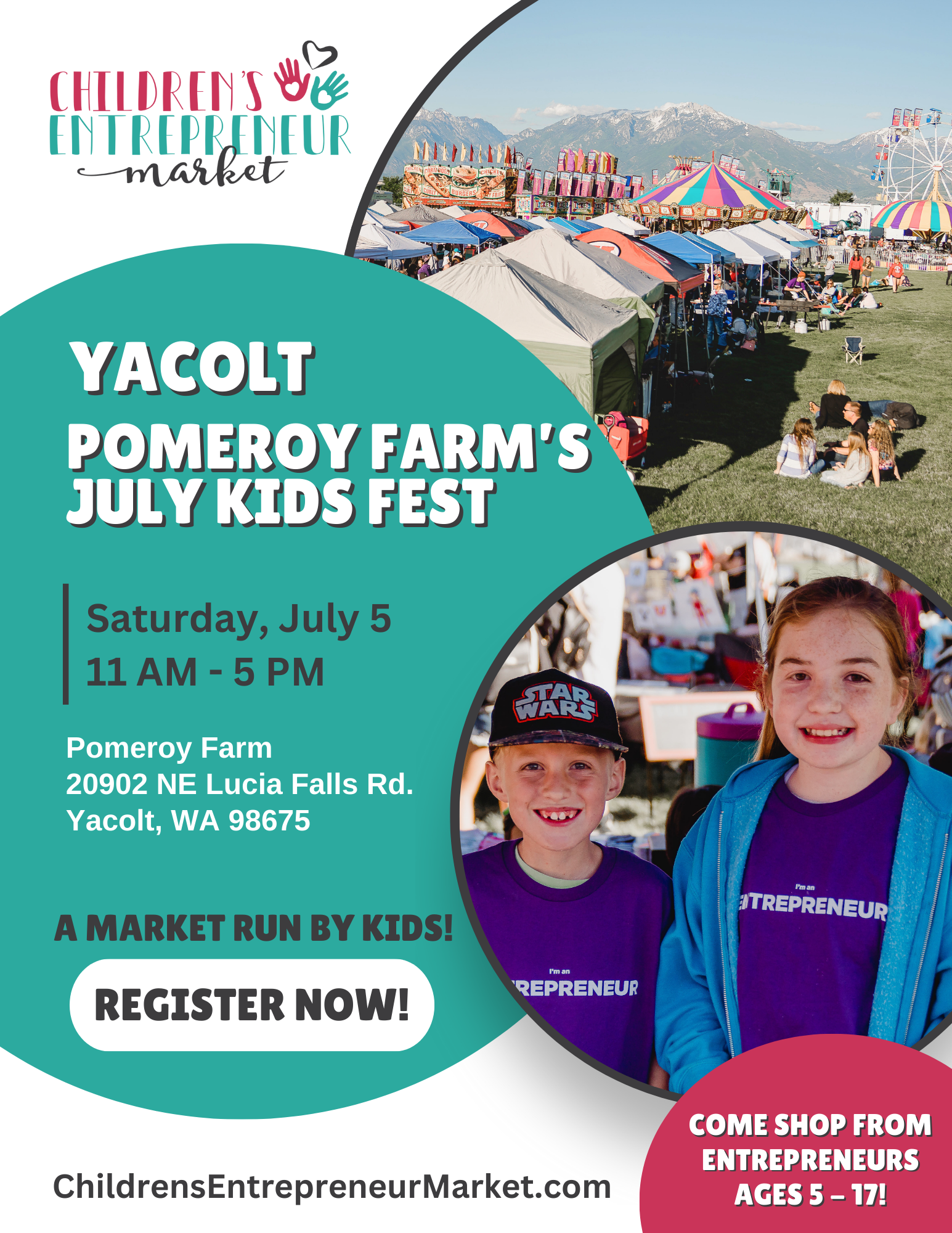 Get ready for a day full of fun, creativity, and kid-powered business! The Children’s Entrepreneur Market is thrilled to be part of the July Kids Fest at Pomeroy Farm, where young entrepreneurs will set up shop alongside an exciting lineup of family-friendly activities. We anticipate 300 patrons at this event!